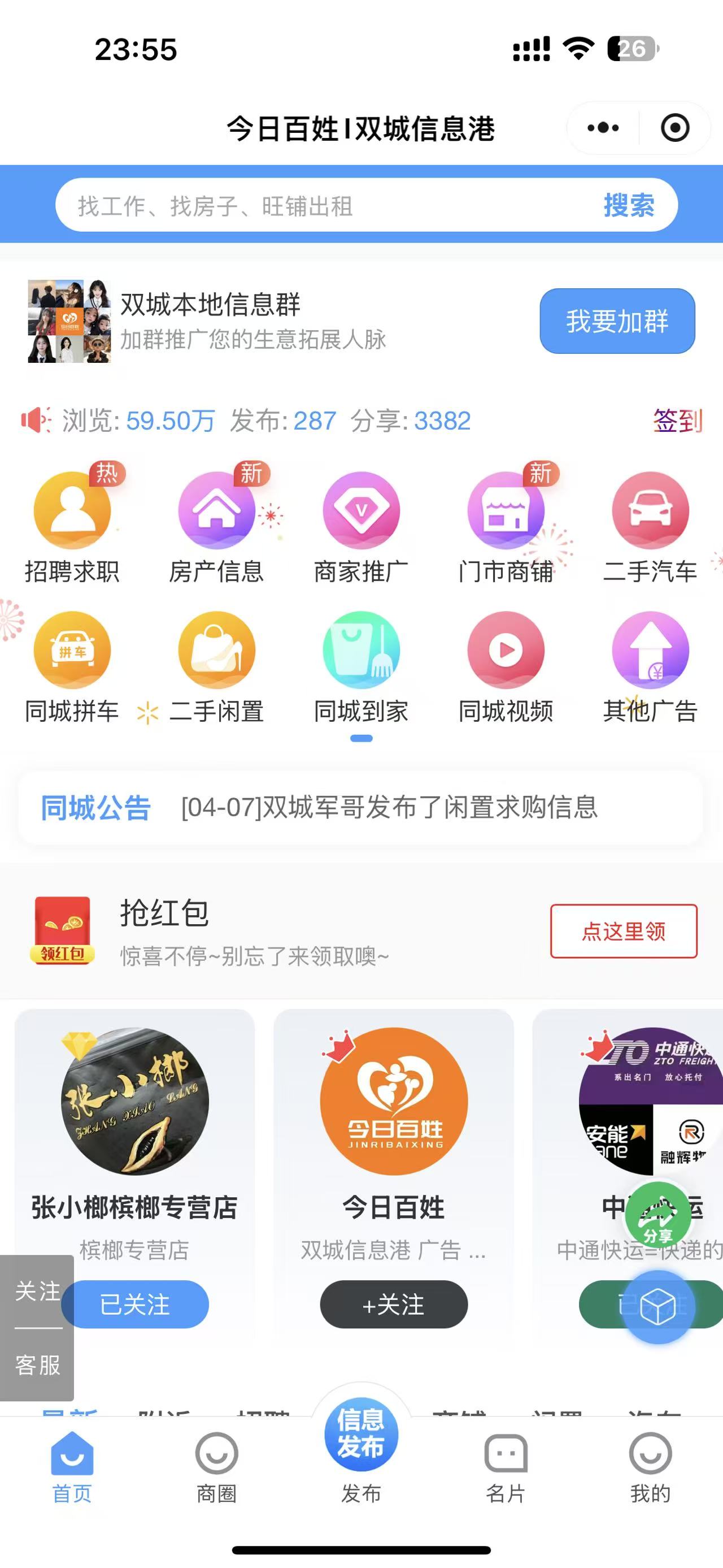 这里有双城各区县本地便民信息,交友搭子,招聘求职,生意转让,二手闲置,二手房二手车买卖,本地服务,农贸市场,便民导航等